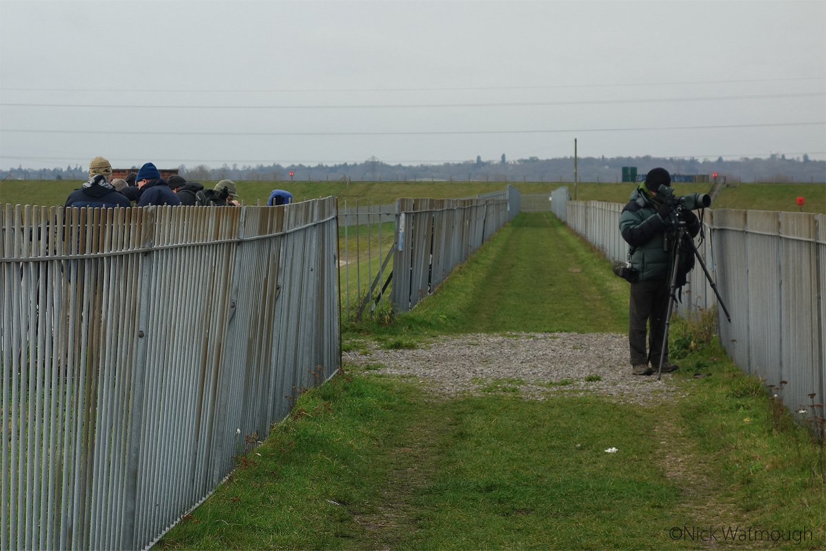 I had to visit my Mother and Sister in Maidenhead on Saturday 27th Jan which gave me the chance to pay a brief visit Staines Reservoir in Surrey to see an American Horned Lark which was found in late November, disappeared after a few days, but re-emerged in the early part of the previous week. Staines lies pretty much at one end of Heathrow’s runways and is essentially an enormous water-filled concrete bowl bisected by a raised causeway whose weedy slopes have provided food and shelter for this vagrant lark. I arrived mid-morning, parked the car by the ramp to the causeway, settled my doggie travelling companion in the back seat and set off. The bird was feeding on the south slope below the furthest viewing bay separated from its observers by a 1.5m barred metal fence that made photography challenging, but not impossible and with patience it was possible to get some decent images.