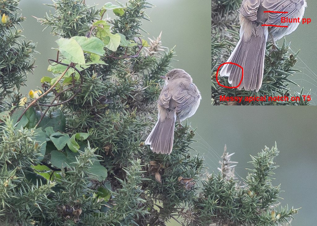 When the possibility of Ménétries’s was raised reference was made to a tricky Curruca Warbler seen on Linosa, Italy in November 2012 (5). Similarly this 1cy individual had replaced its spiky sandy coloured juvenile tail feathers with dark grey adult feathers. Moreover T6 on the Linosa individual was wholly white and T5 had a small white apical notch. However, it did not call like a Moltoni’s. This led the Italian observers, who were very familiar with ESW ssp cantillans and Moltoni’s Warbler, to consider Ménétries’s. However further analysis of their images did not support this conclusion and that in fact it was a WSW ssp inornata. It must be remembered that this form is now included in the the monotypic taxon Curruca iberiae (see Fig 1).