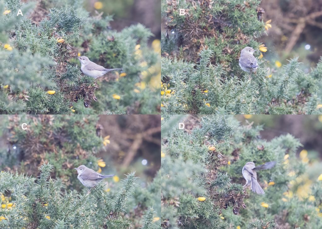 The Scilly bird certainly never gave the double call associated with ESW ssp albistrata (panel D). To my eyes the spectrogram of the Scilly individual (Panel A) exhibits the “dense vertical structure” of WSW calls (panel B) noted by Menzies et al (3). Both spectrograms reflect the hard tack uttered by the Scilly bird and XC369011. To my ears this is quite different to the softer “t’chek” note of ESW ssp cantillans (XC413121). This difference is reflected in the spectrogram which appears to be more “open”. In other words it is less dense and possible to pick out individual harmonics. Note also the range of frequencies represented is somewhat less that those present in the Scilly bird and XC369011. Interestingly spectrograms of the calls of the Linosa bird (4) appear consistent with its identification as WSW.