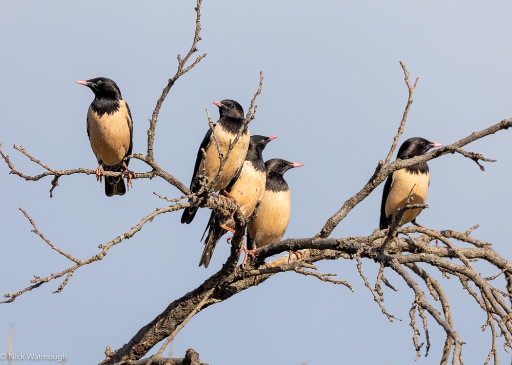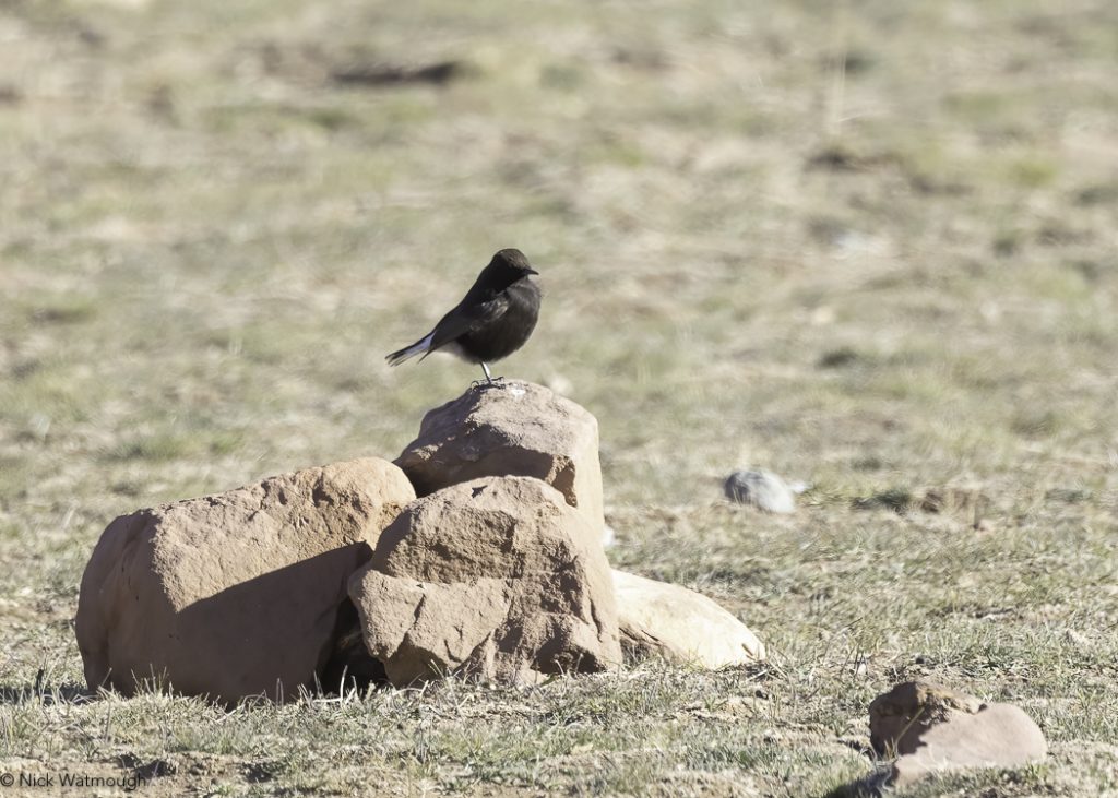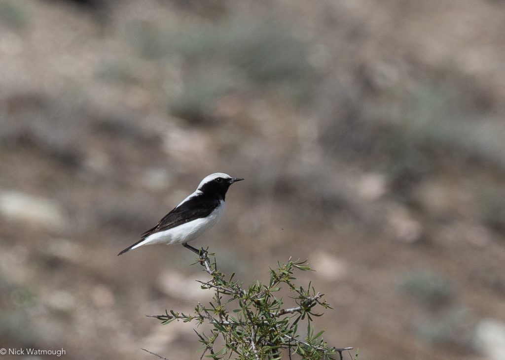 As we returned to the car Graham picked up a large falcon terrorising a distant flock of Rosy Starlings. No time to get images but good enought views to determine it was a Saker (WP #74x). We hung around for a bit, but it did not reappear. Driving out of the wadi a monochrome wheatear with a complete back tail-bar flew across the road – Finsch’s Wheatear