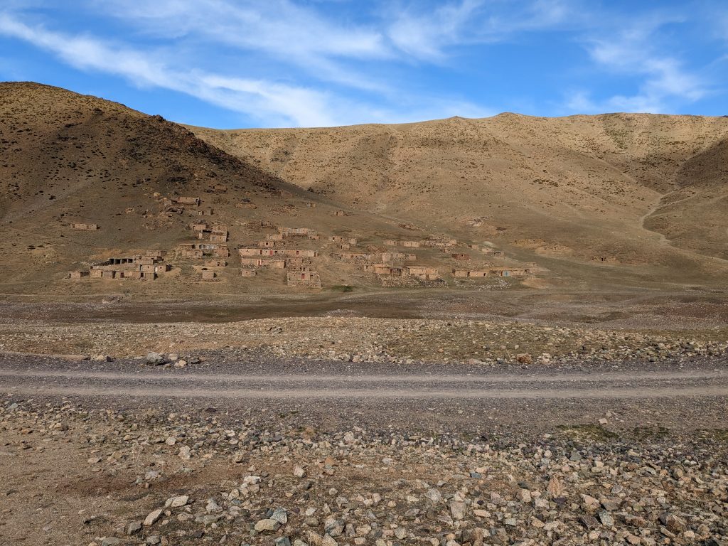 Continuing along the road we dropped into a wide valley and could see a settlement to our right. The farm building and dry stone walls tallied with the descriptions from some trip reports.