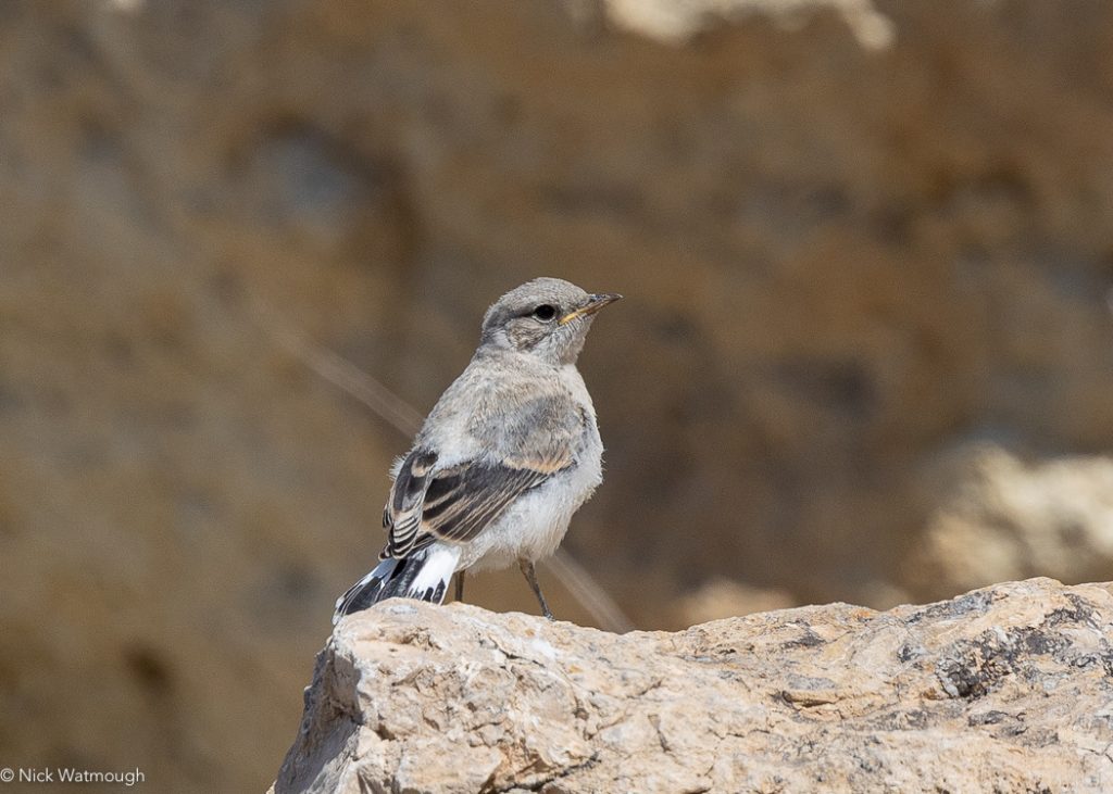 Whilst this was quality birding there was no sign of the star turn. Leaving Gramham to photograph Eastern Black-eared Wheatear I slowly started to climb the scree covered slope towards the cliffs. The terrain was uncertain and it took me some twenty minutes to reach the big boulders at the base of the cliffs. Here I heard an unfamilar song not far away. Arms out-stretched and holding on tight to keep my footing I peered over the top of a big rock. A small bird with a red tail jumped up on top of some nearby boulders – Persian Wheatear (WP #743). Bollocks! If I let go to use my camera I would take a big tumble! Gingerly I worked my way to a more stable position, but the birds saw me and flew up to the high cliffs.