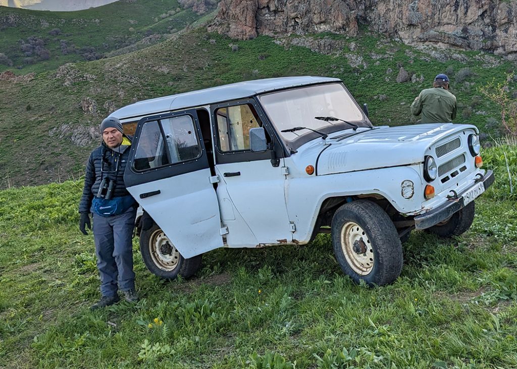 Next morning our alarms went off a stupid o’clock and we crept downstairs to collect packed breakfasts from Anna’s kitchen. At 6 am, bang on cue, a white Lada Niva pulled up outside the B&B. By arrangement out stepped two camo clad rangers from the Arpa Protected Landscape. They would take us up nearby Mount Gdnasar in search ofCaspian Snowcock. This is one of several species found in Armenia that I had not seen since an epic trip around Türkyie in 1986. Other hold outs from that tour include Bimaculated Lark, Grey-necked Bunting, Radde’s Accentor and Eastern Rock Nuthatch.